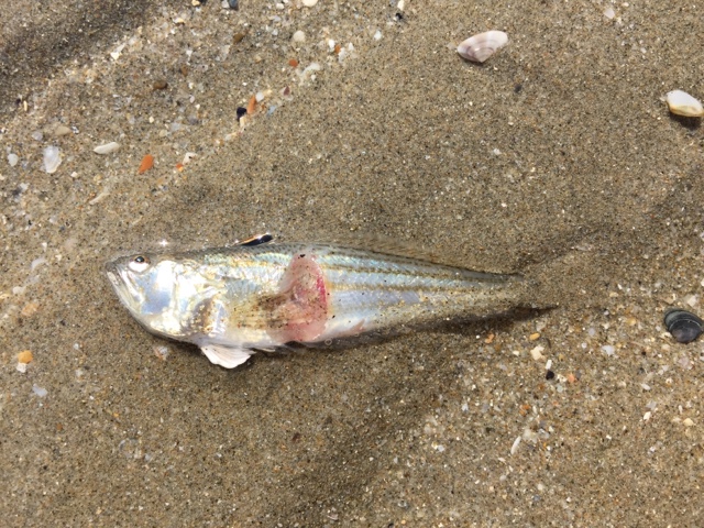 Tracina vipera morta a pelo dell'acqua con un'evidente ulcera su di un lato.
